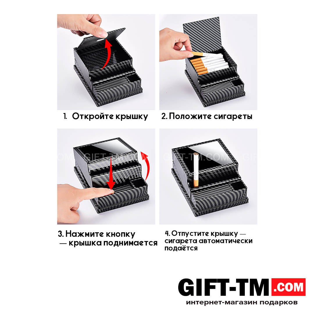 Портсигар оснащен автоматическим механизмом: одним нажатием подается одна сигарета, что делает использование быстрым и комфортным. Вместительность — до 40 сигарет, что соответствует двум стандартным пачкам. В конструкции предусмотрен отдельный отсек для зажигалки — она всегда находится на своем месте и не теряется.