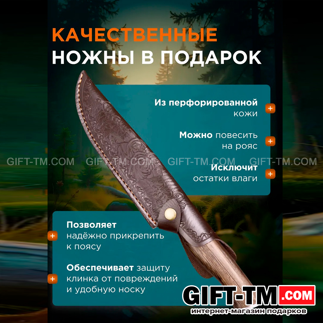 Удобная деревянная рукоять обеспечивает комфортный хват, а прочный клинок справится с самыми разными задачами на природе. Чехол из искусственной кожи надёжно защищает нож и позволяет носить его с собой в удобном формате.