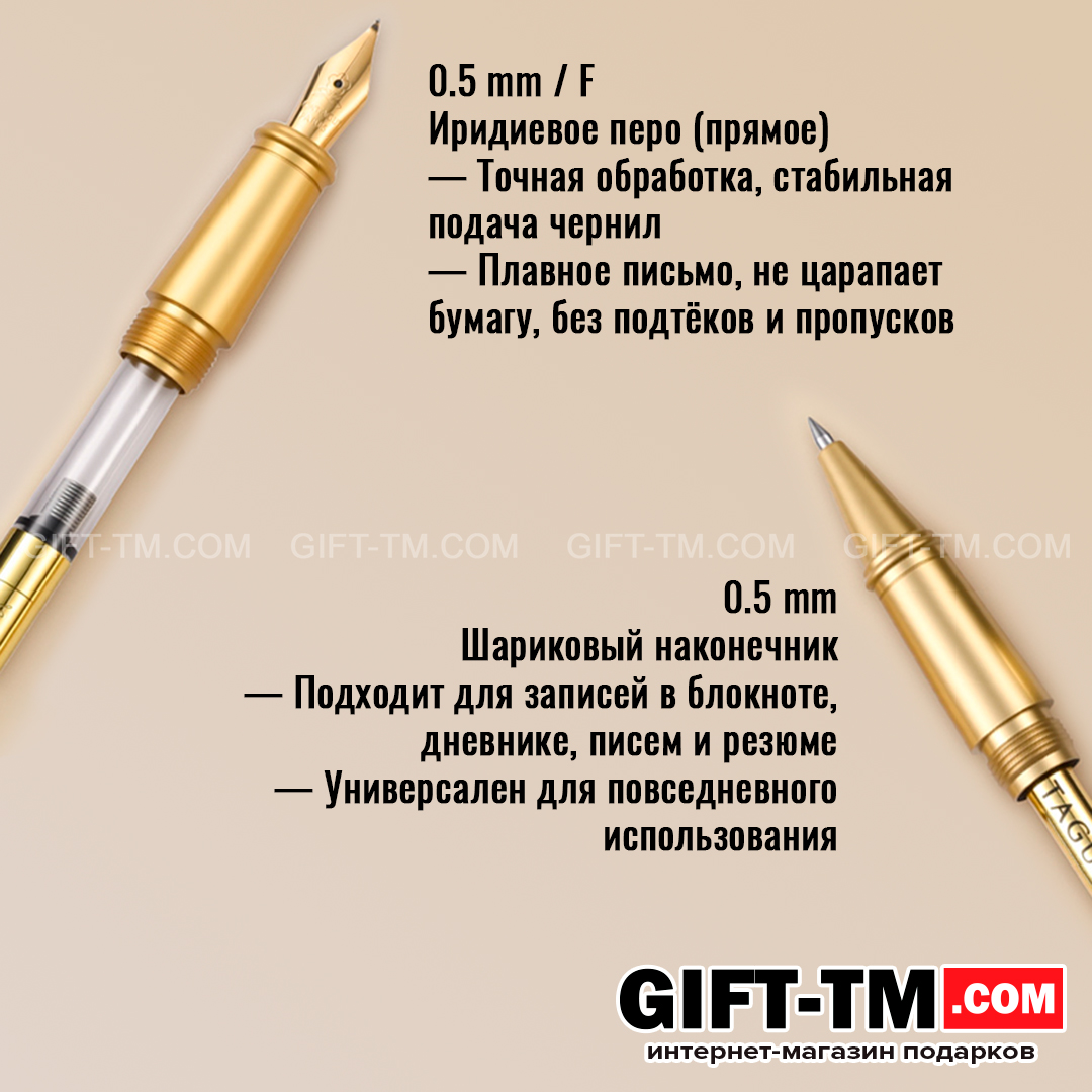 Металлический корпус с покрытием в оттенке шампань выглядит благородно и современно. Ручка удобно лежит в руке, обеспечивая комфорт даже при длительном письме. Система быстрой смены наконечников позволяет легко адаптировать инструмент под разные задачи — от ежедневных записей до каллиграфических работ.