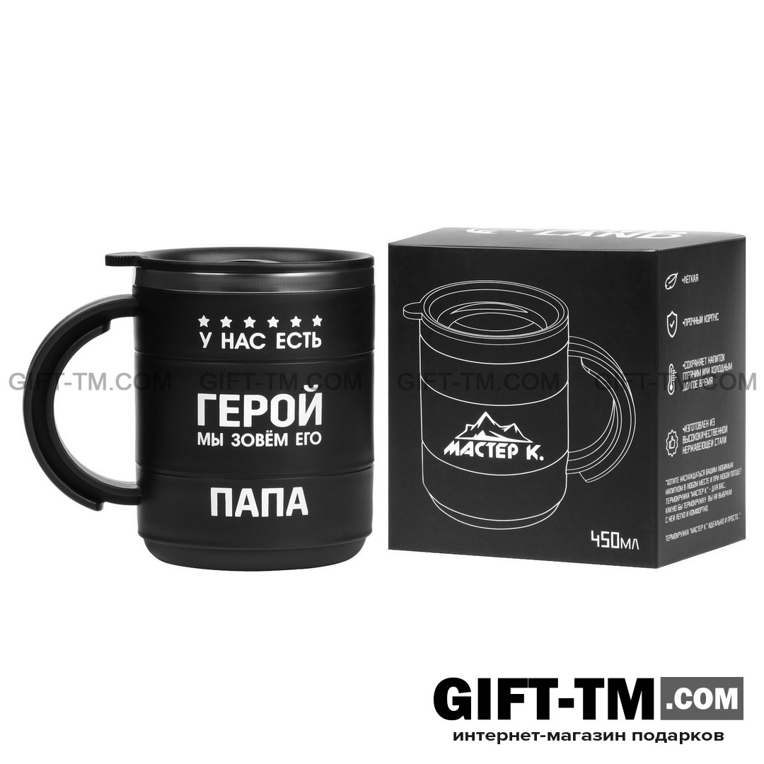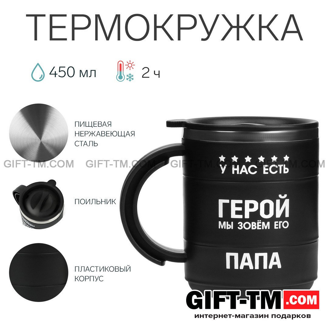 Термокружка «У нас есть герой — Папа» станет не только удобным аксессуаром, но и тёплым напоминанием о вашей любви и уважении к самому важному человеку!