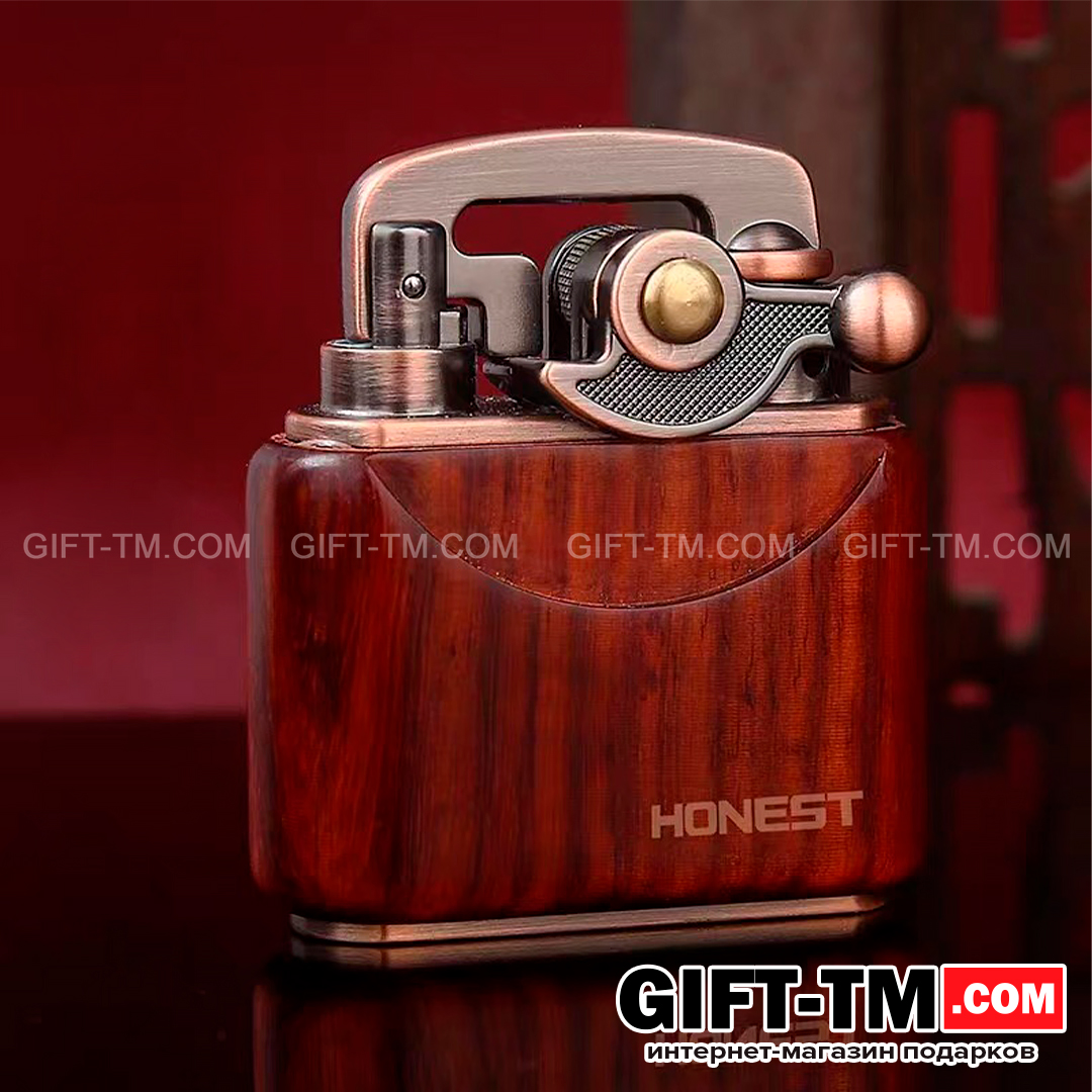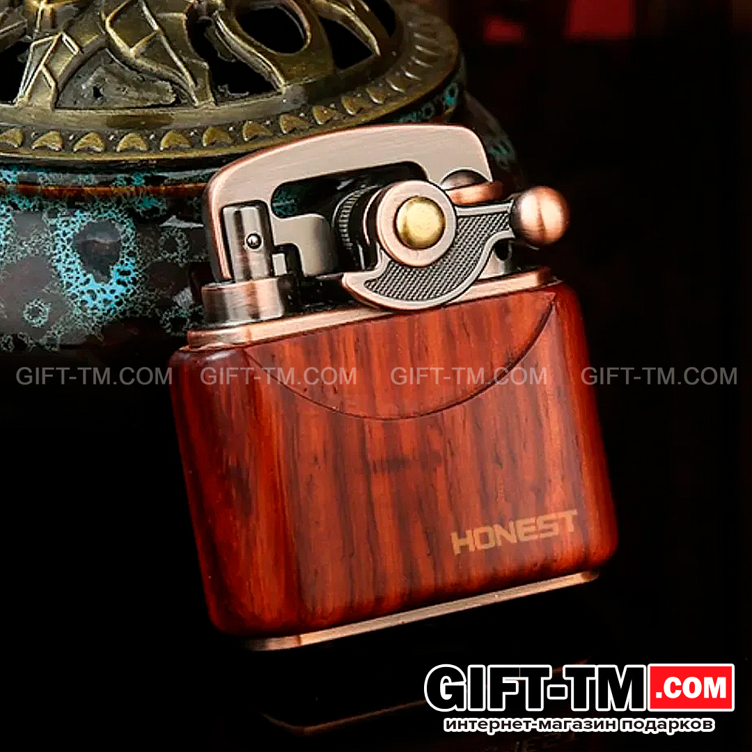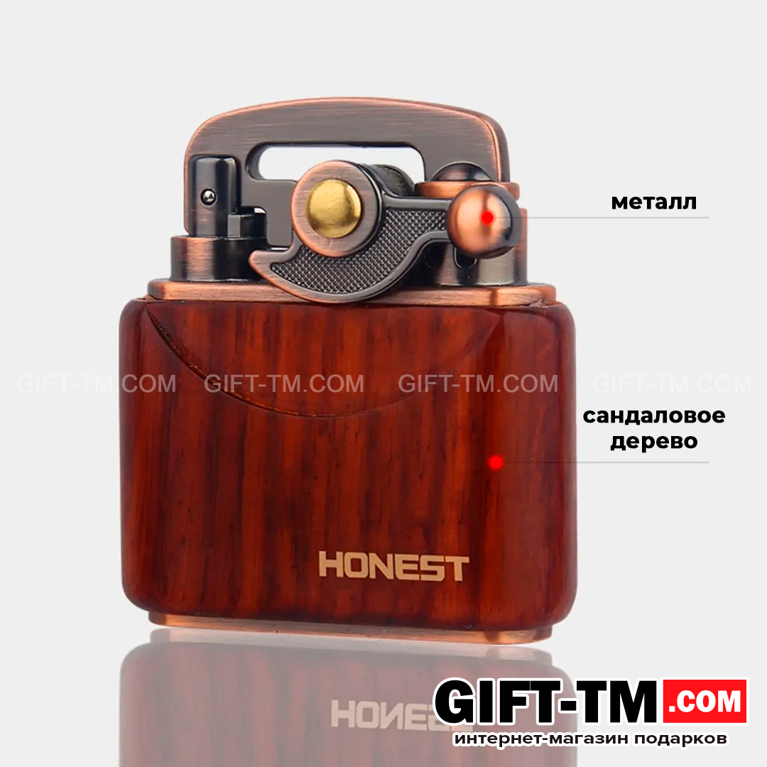Бензиновая зажигалка HONEST — стильный и надёжный аксессуар с корпусом из металла и отделкой из натурального сандалового дерева. Механизм поджига работает с помощью поворота рычажка: при нажатии автоматически открывается крышка, после чего достаточно отпустить рычажок, чтобы высечь искры и поджечь фитиль.
