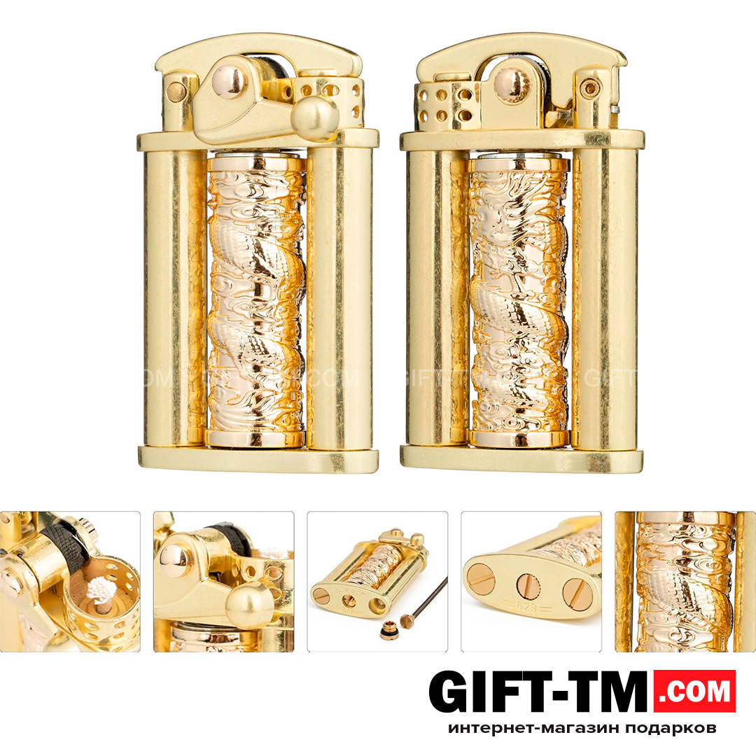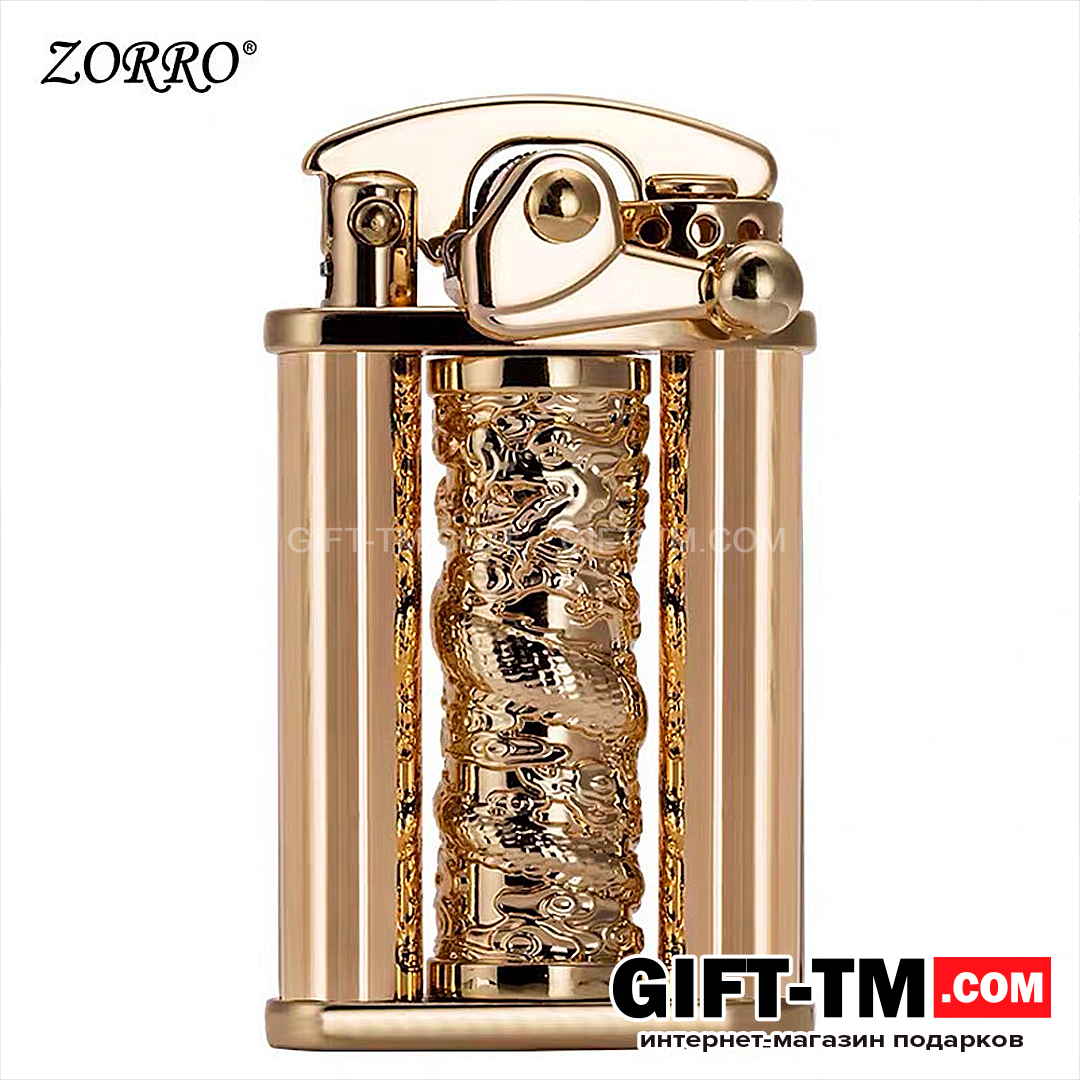 Бензиновая зажигалка Zorro «Dragon» — эффектная модель в золотом исполнении, сочетающая стильный внешний вид и удобный функционал. Корпус изготовлен из чистой меди и прочного цинкового сплава, благодаря чему зажигалка выглядит солидно и служит долго.