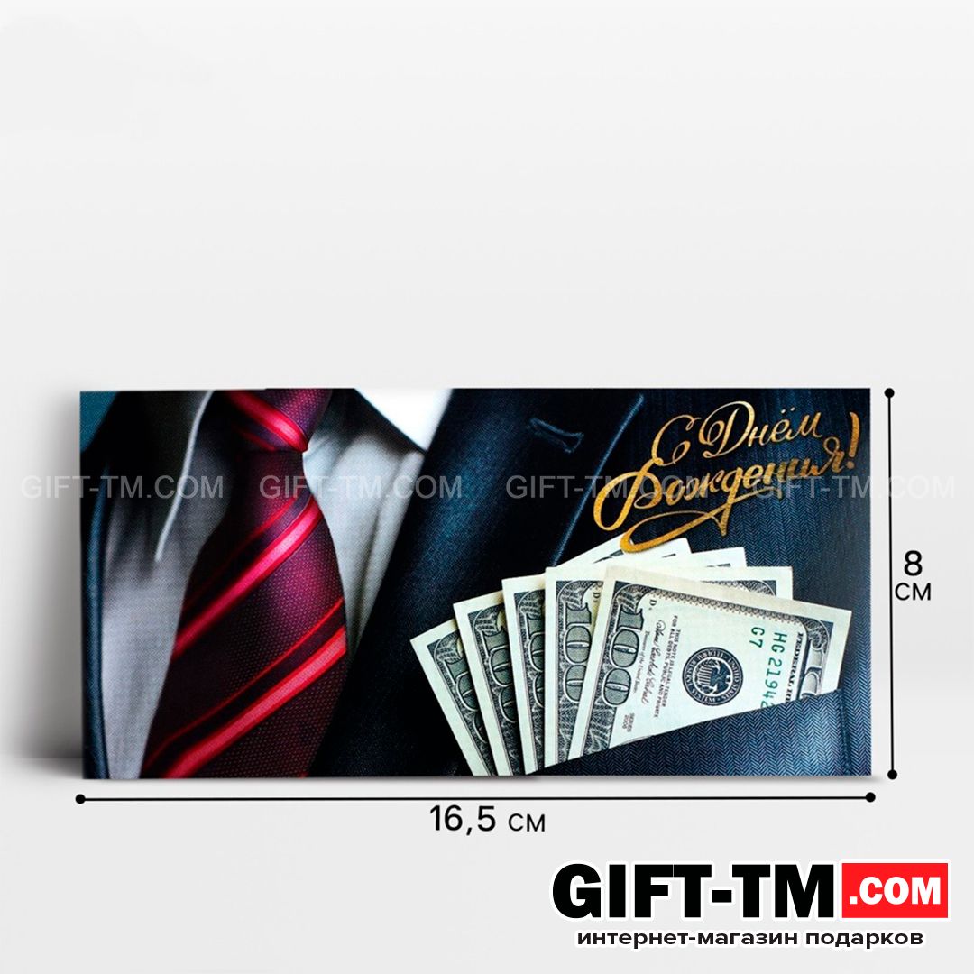 Конверт оформлен в лаконичном дизайне с тематической надписью, которая делает его подходящим вариантом для вручения поздравительных денежных подарков на дни рождения и другие торжественные события.