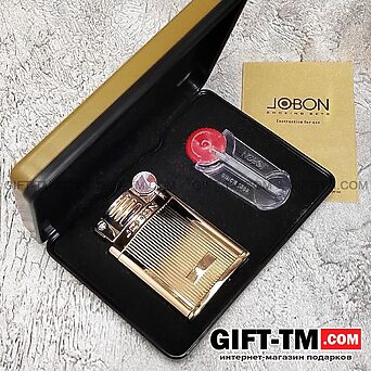 Стильная бензиновая зажигалка Jobon упакована в металлическую подарочную коробку. Корпус зажигалки так же изготовлен из металла. Крышка зажигалки открывается автоматически при нажатии на кнопку. Пружинный механизм откидывает крышку, одновременно высекая искры, поджигает фитиль.