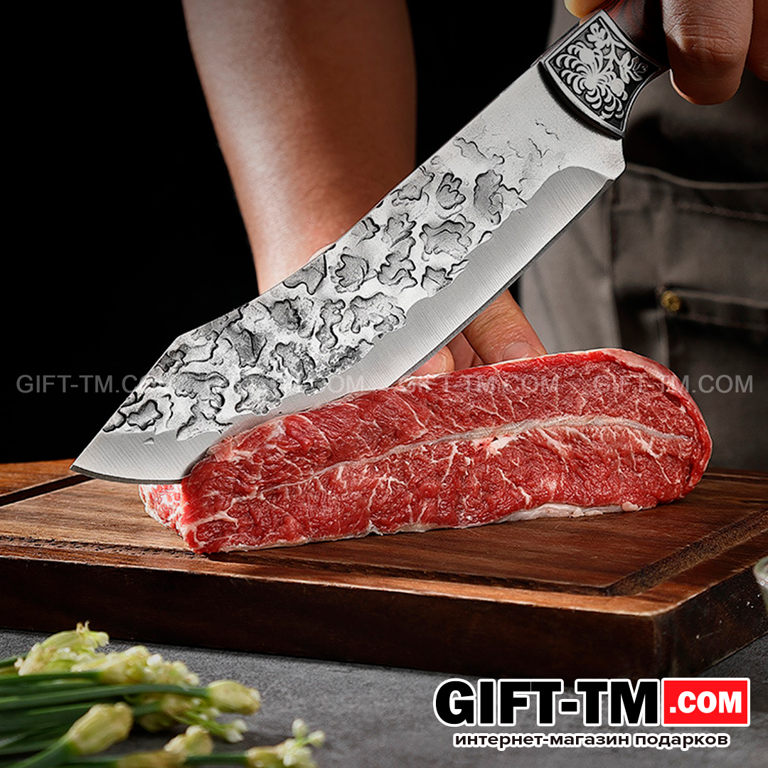 Клинок выполнен из стали 4Cr13, которая отличается хорошей износостойкостью и устойчивостью к коррозии. V-образная заточка обеспечивает уверенный и точный рез мяса, овощей и других продуктов, а цельная конструкция ножа повышает прочность и долговечность при активном использовании.