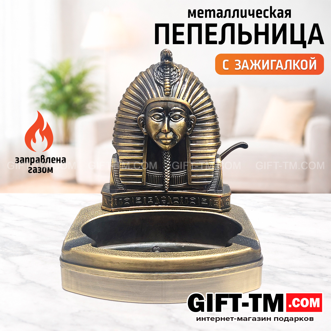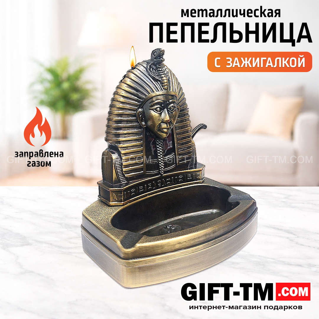 Пепельница «Фараон» с зажигалкой — выразительный аксессуар в стиле древнего Египта, который сочетает практичность и эффектный дизайн. Фигура фараона с характерным головным убором символизирует силу, власть и статус, превращая изделие не просто в функциональный предмет, а в стильный элемент интерьера.