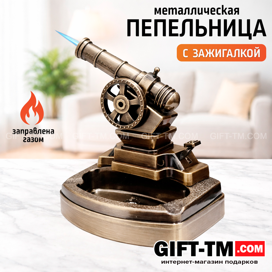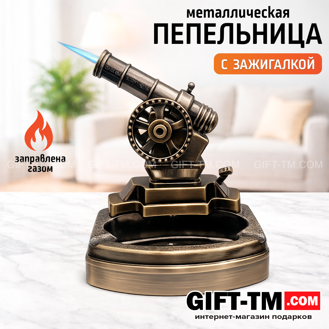 Пепельница «Пушка» с зажигалкой — эффектный аксессуар с брутальным дизайном, который сочетает функциональность и выразительный внешний вид. Декоративный элемент в виде пушки придаёт изделию оригинальность и делает его заметной деталью интерьера.