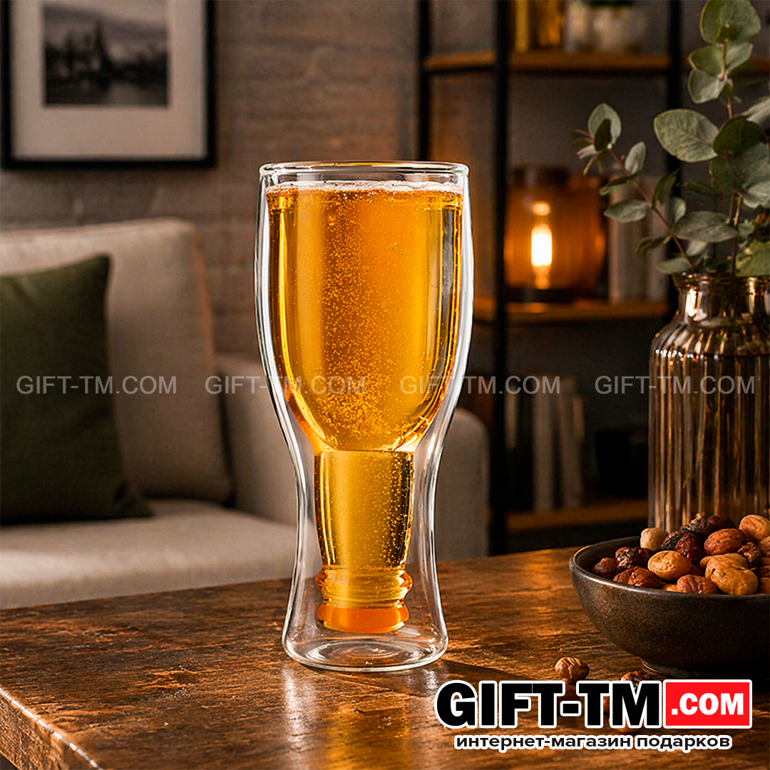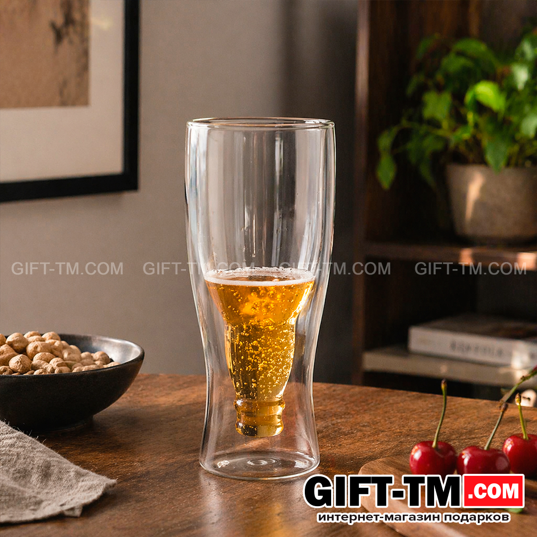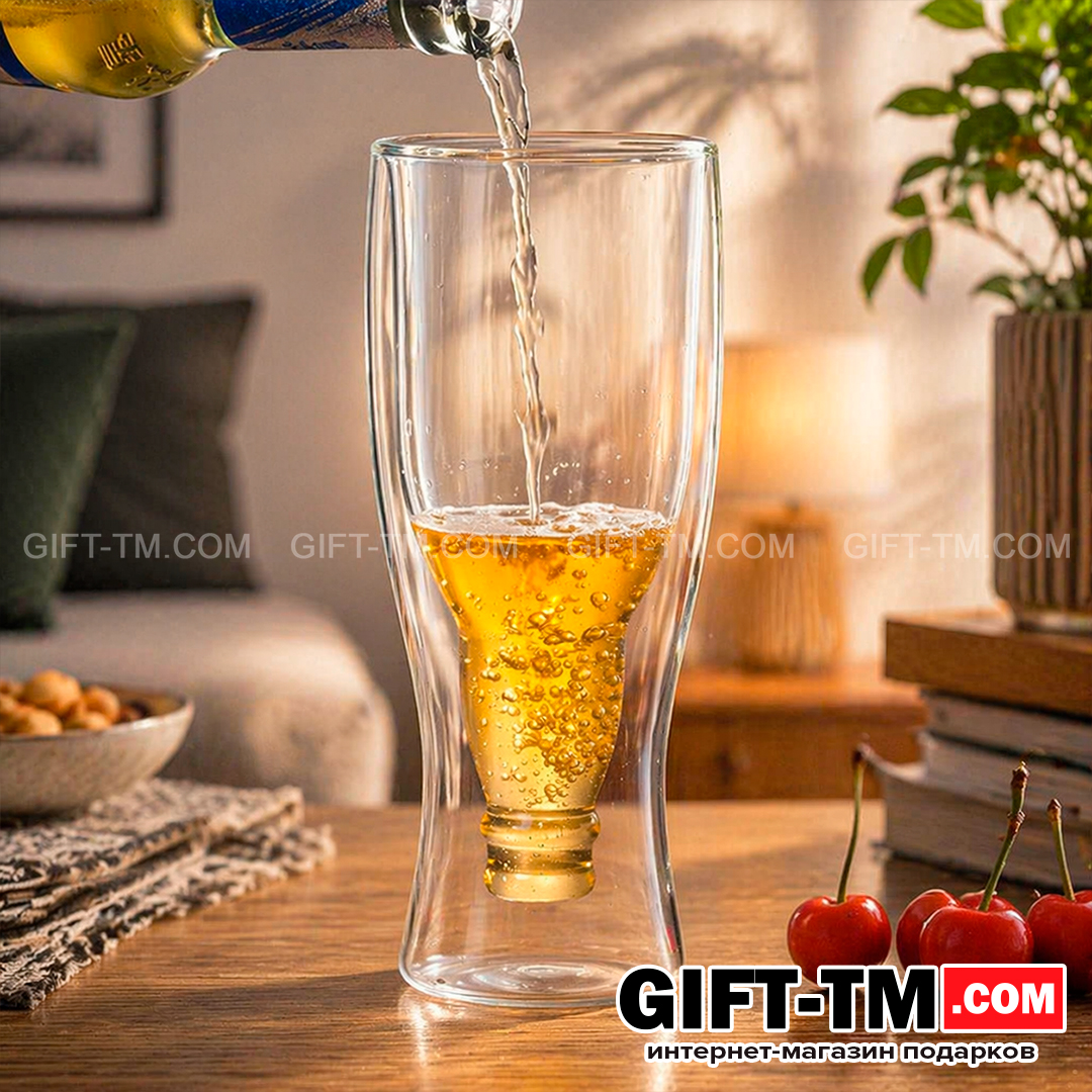 Пивной бокал «Перевернутая бутылка» 350 мл — оригинальное решение для тех, кто ценит необычные детали и эффектную подачу напитков. Внутренняя часть выполнена в форме перевёрнутой бутылки, благодаря чему бокал выглядит нестандартно и сразу привлекает внимание.