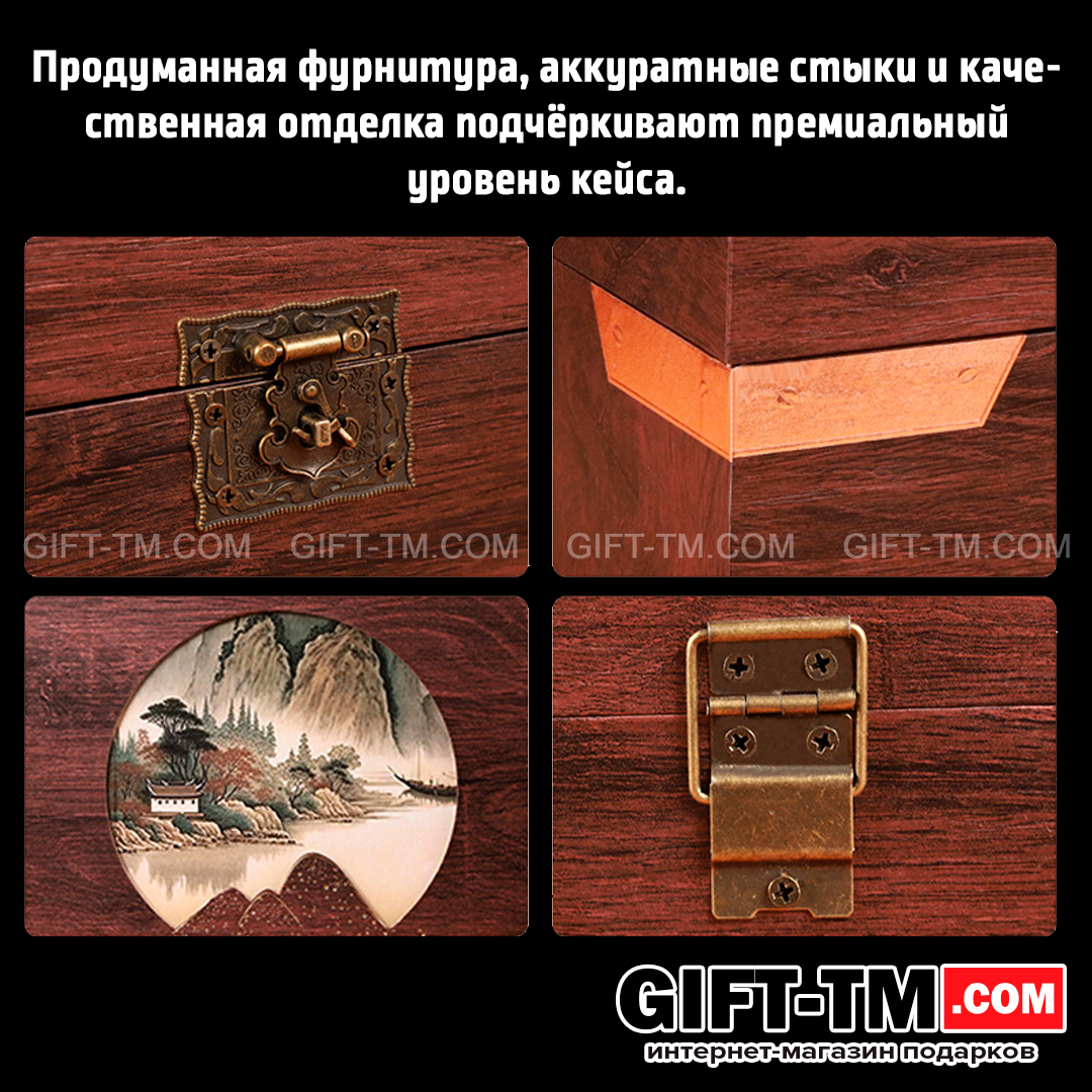- Деревянная подарочная шкатулка: 32,5 × 15 × 19 см;