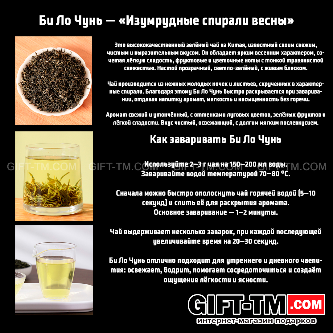 - Би Ло Чунь — зелёный чай, 250 г. Лёгкий, свежий и ароматный, с цветочно-фруктовыми нотами, мягкой сладостью и чистым послевкусием.