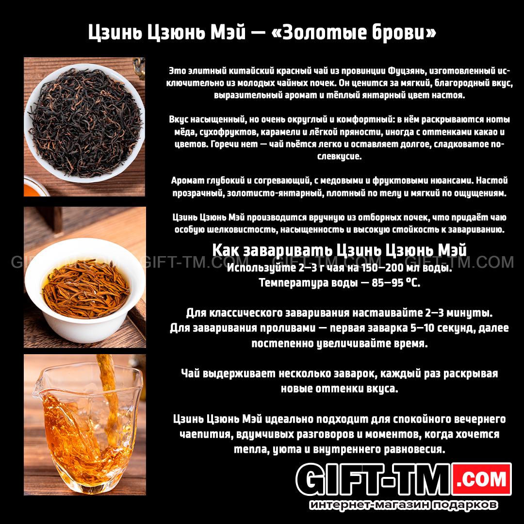 - Цзинь Цзюнь Мэй — красный чай, 250 г. Насыщенный и благородный, с оттенками мёда, сухофруктов, карамели и тёплым долгим послевкусием.