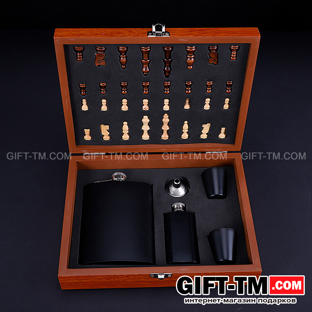 - Комплектация: фляга, мини-фляжка, стопки, воронка, шахматы, коробка