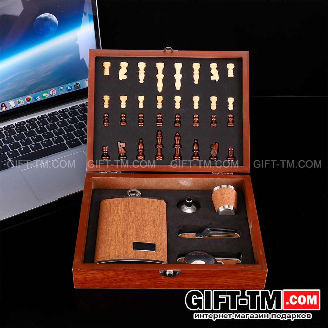 Подарочный набор «Фляжка и шахматы» — практичный и стильный комплект для отдыха и досуга. Все элементы аккуратно размещены в деревянной коробке с крышкой в виде шахматной доски, что делает набор не только функциональным, но и эстетичным.