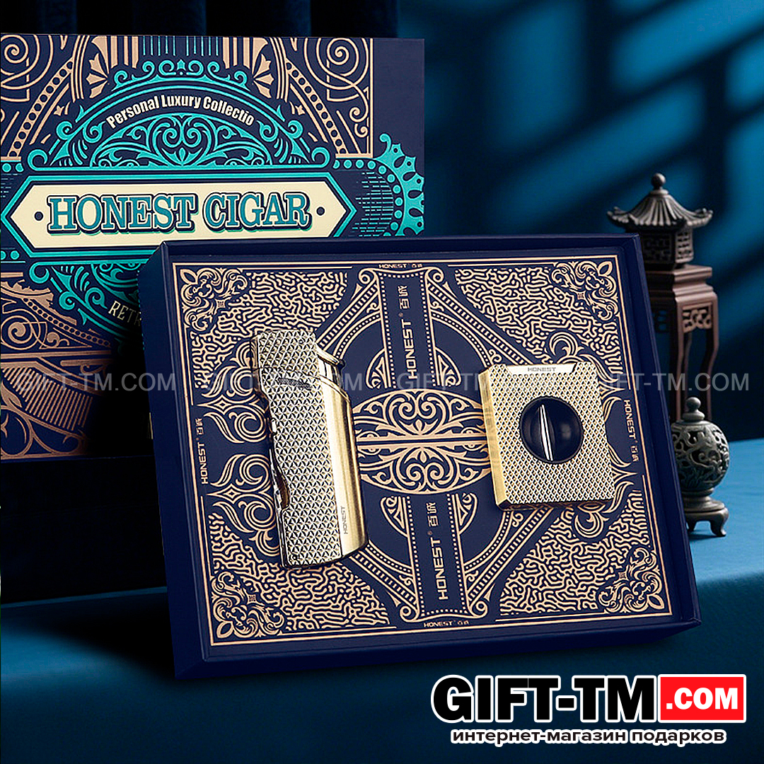 Подарочный набор «Honest» — стильное решение для ценителей сигар и качественных аксессуаров. В комплект входит газовая зажигалка и гильотина для сигар, выполненные в едином дизайне с эффектной текстурированной поверхностью. Такой набор выглядит солидно и отлично подходит в качестве презента.