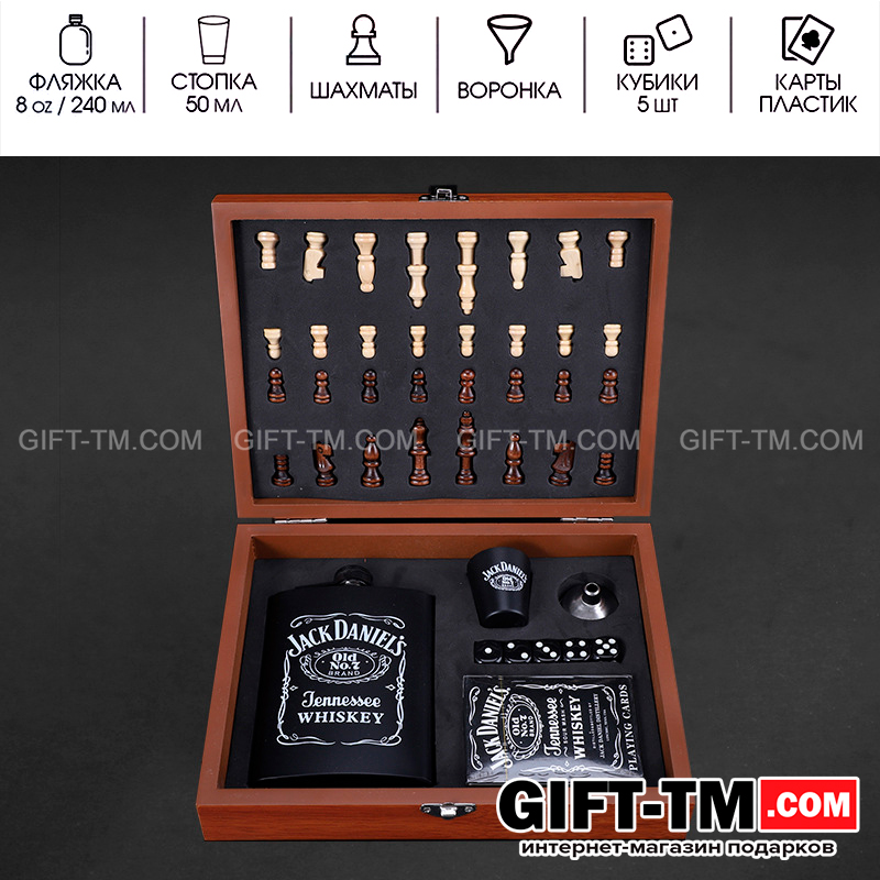 Подарочный набор в стиле Jack Daniels — идеальное сочетание брутальности, стиля и функциональности. Всё, что нужно для отличного отдыха, собрано в одной деревянной коробке с шахматной доской на крышке.