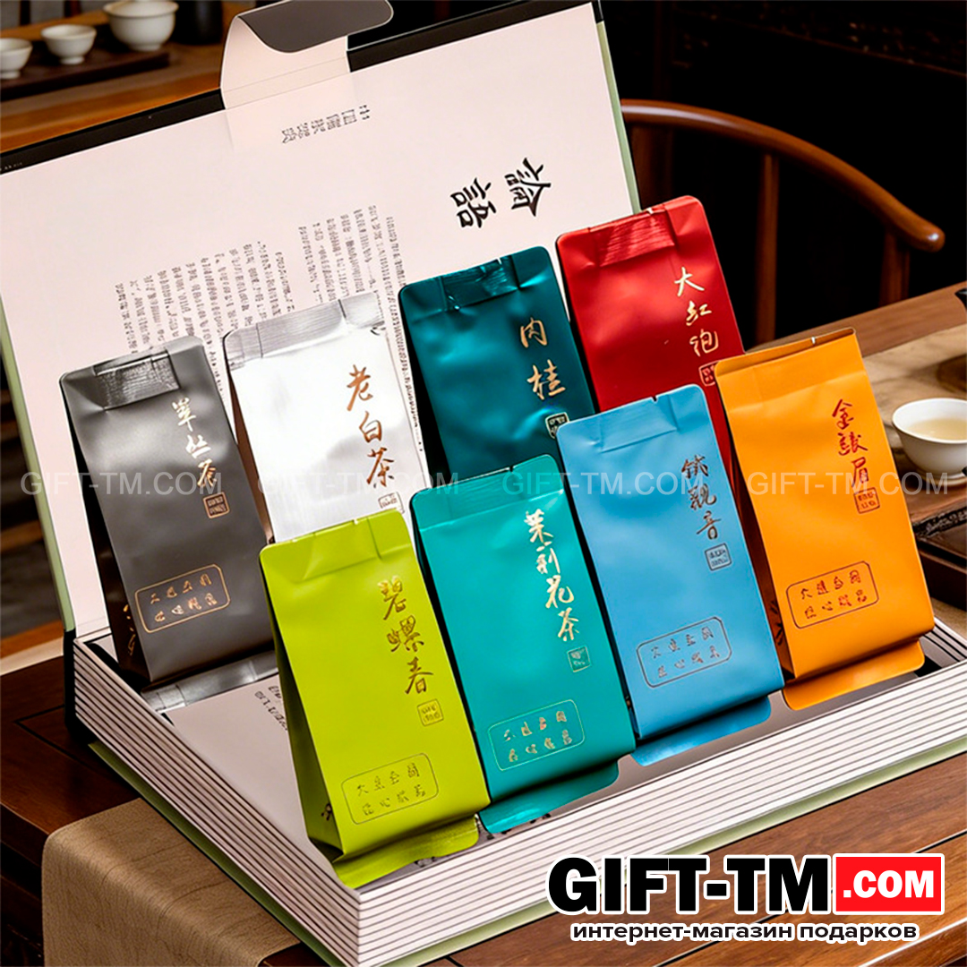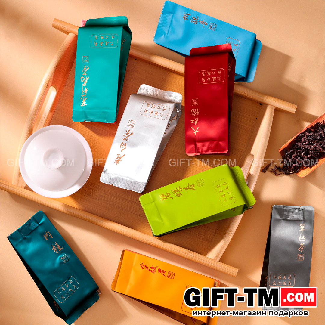 Внутри собраны 8 видов китайского чая — от насыщенных улунов до мягких зелёных и ароматных цветочных сортов. Это отличная возможность попробовать разные вкусы, сравнить ароматы и выбрать свой любимый вариант.