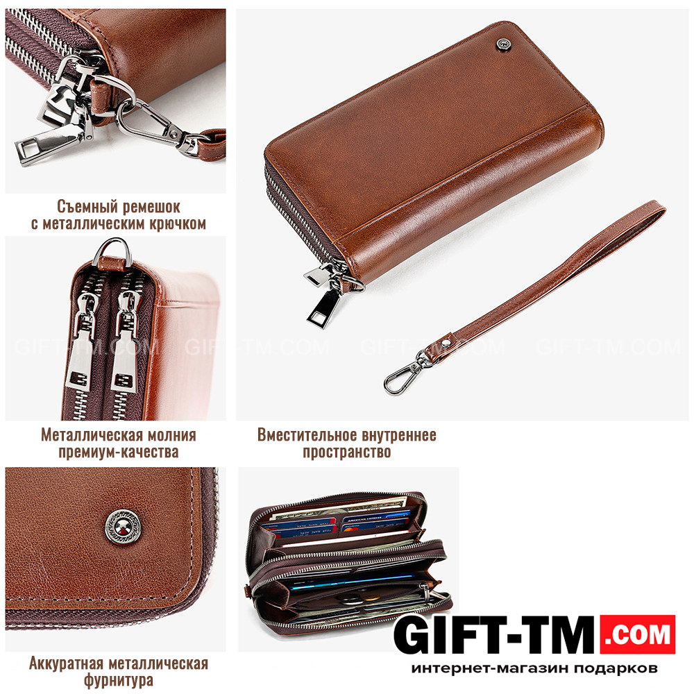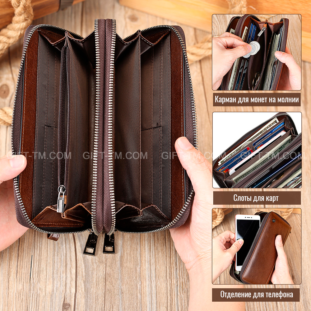 Портмоне-кошелёк с двумя застёжками — практичное и вместительное решение для повседневного использования. Модель выполнена из натуральной кожи и сочетает в себе функциональность кошелька и удобство хранения телефона.