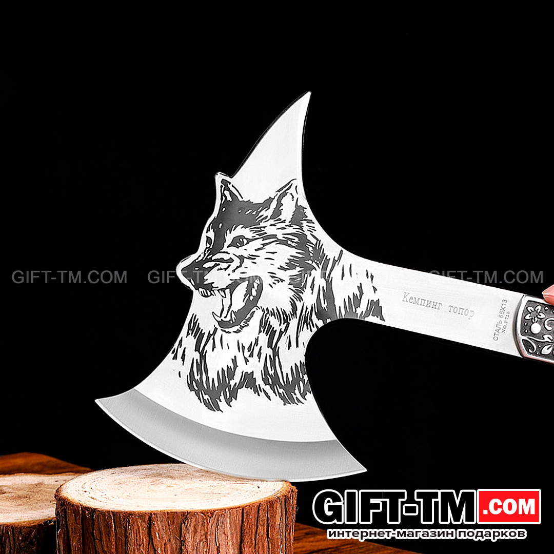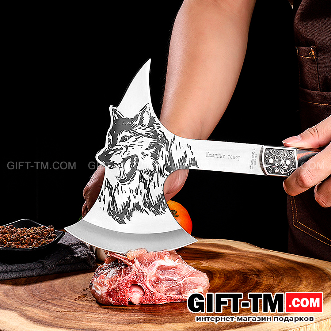 Топор для пикника «Волк» – надежный инструмент и эффектный аксессуар для любителей активного отдыха на природе. Изготовлен из прочной нержавеющей стали с художественной гравировкой в виде волка, этот топор сочетает практичность и стиль.