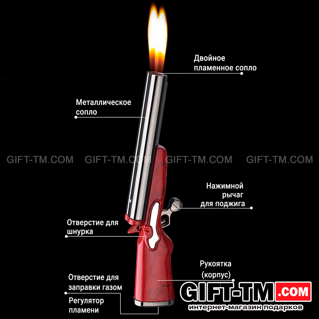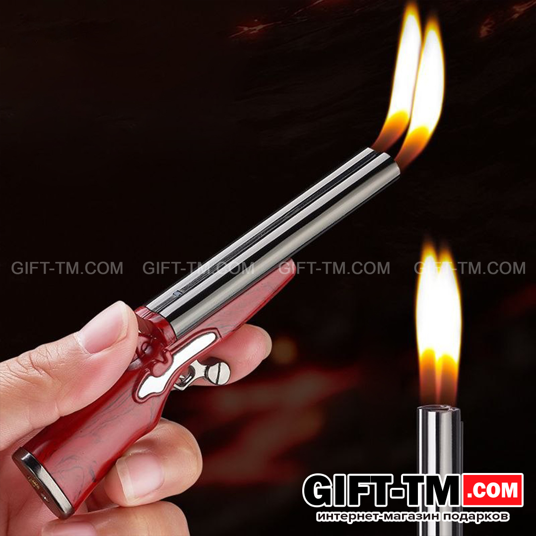 Зажигалка оснащена двойным пламенем, что обеспечивает быстрое и удобное зажигание. Пламя активируется при нажатии на рычаг, имитирующий спусковой механизм, что делает использование не только практичным, но и эффектным.
