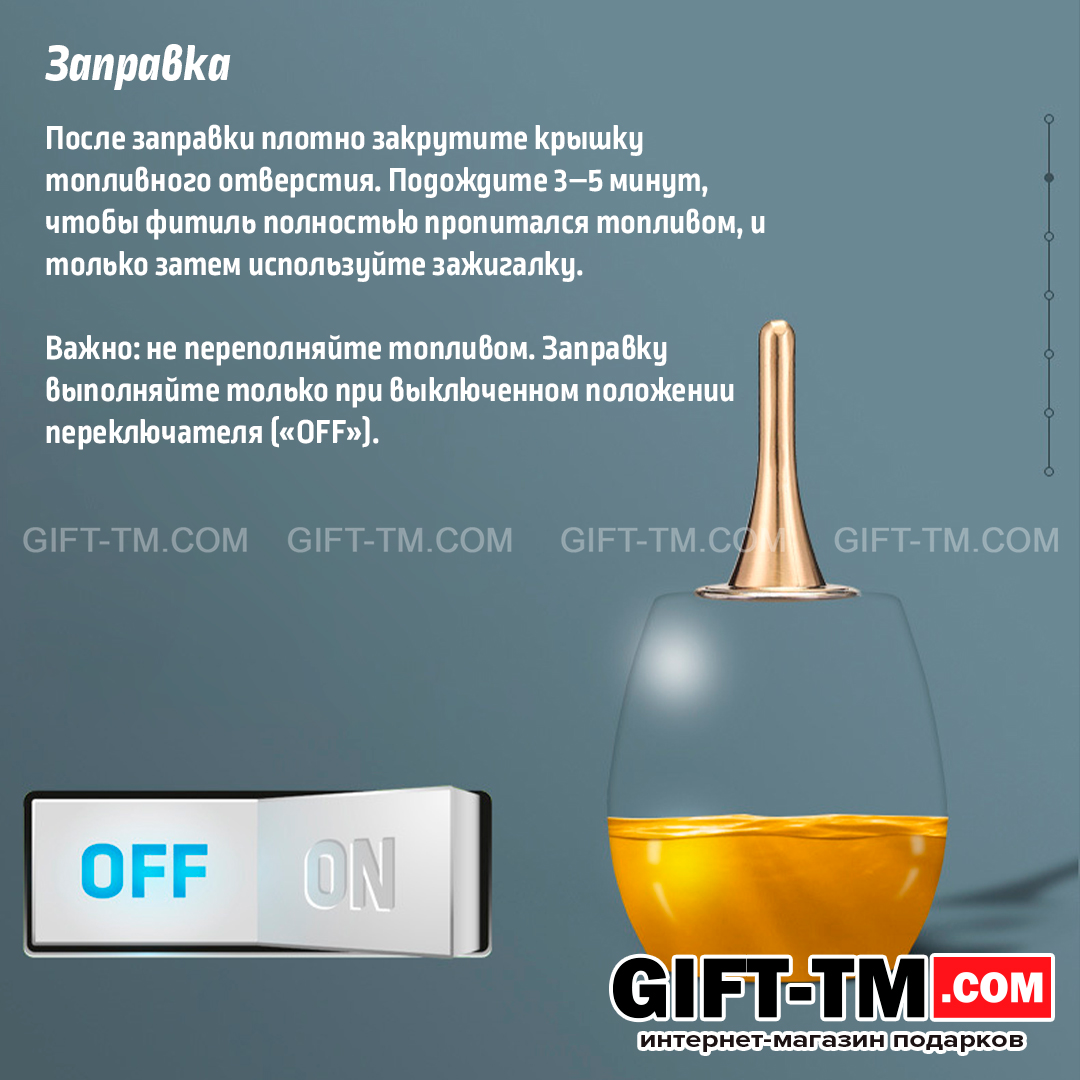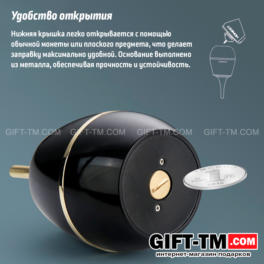 Заправка выполняется легко — нижняя крышка открывается с помощью монеты. После заправки рекомендуется подождать несколько минут, чтобы фитиль полностью пропитался топливом.